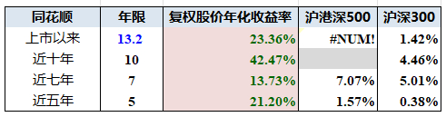 公司上市以来,近十年、近七年、近五年的复权股价年化收益率与同期有效参照规模指数对照如下表:
