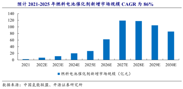 而据中国氢能联盟数据,2021年我国燃料电池电堆年新增市场规模约为6.2亿元,专业机构预计2025、2030年,燃料电池电堆新增市场分别为75、238亿元。依照催化剂成本占电堆成本的36%推算,2021年氢燃料电池催化剂新增市场规模约为2.32亿元,预计2025年达27亿元,期间年均复合增速高达86%。