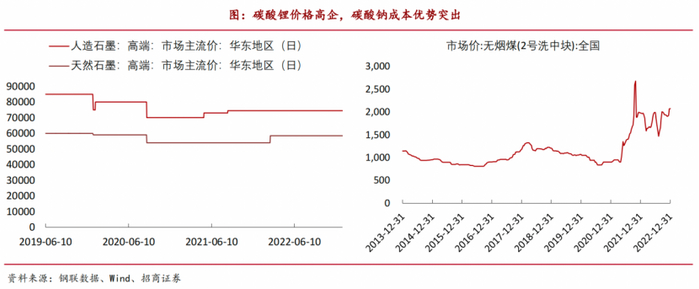但在钠离子电池中,石墨材料在碳酸酯电解液中的可逆比容量不足50mA·h/g,应用受到了很大的限制,而无定形碳类负极(包括硬碳和软碳)表现出较高的可逆比容量和较好的循环性能。其采用的无烟煤成本非常低廉,通过简单粉碎和一步碳化便可制得(产碳率高达90%),可逆比容量达220mA·h/g。截至2022年12月31日,全国无烟煤市场价为2072.1元/吨,较石墨价格差距极大。