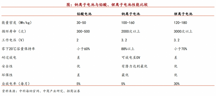 据招商证券研究,钠离子电池相较锂离子电池,具备显著优势:电解液导电性能好,低浓度电解液成本低;低温表现好,热稳定性高,安全性好;能量密度略低,循环次数相对较高。