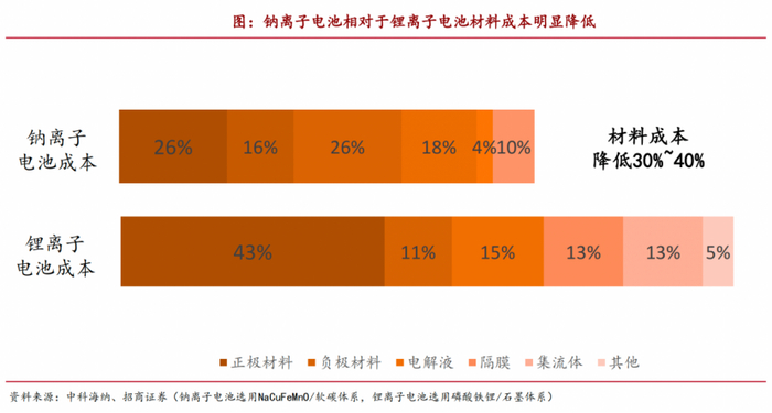 据中科海纳测算,以NaCuFeMnO/软碳体系的钠离子电池,相较磷酸铁锂/石墨体系的锂离子电池材料,成本可降低30-40%。从成本材料结构来看,锂离子电池正极材料成本占比最高(约43%),而钠离子电池的正极材料成本仅为26%。