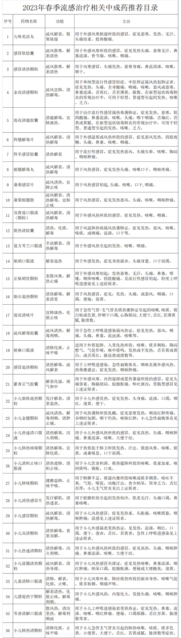 同时,北京市中医管理局还印发了《2023年春季流感治疗相关中成药推荐目录》,从疏风解表、清瘟解毒、疏风宣肺、化痰止咳、理气和中等多个方面推荐了36款适用中成药。在新冠疫情期间遭哄抢的连花清瘟胶囊也榜上有名。