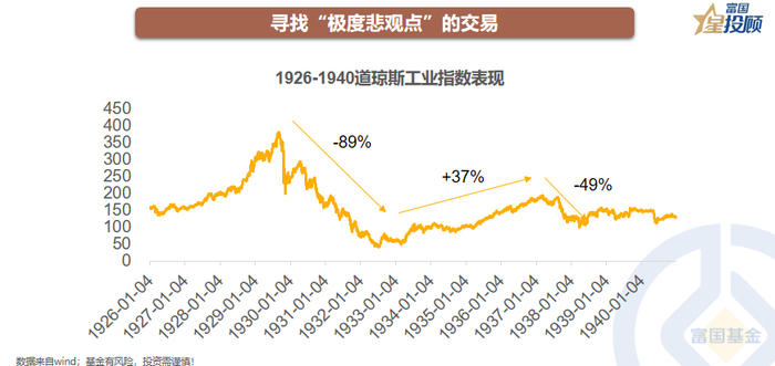 牛市在悲观中诞生,在怀疑中成长,在乐观中成熟,在兴奋中死亡。1929年起美国经济大萧条一直持续长达10年之久,股市的崩溃、经济的衰退和可怕的30年代是这一阶段标签,但即便如此,股市依然出现过回报可观的时期。对于“便宜货猎手”而言,“极度悲观点”是一个重要观测指标,当远低于价值的价格出现之时,也就是便宜货猎手扣动扳机的之际。