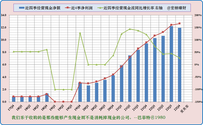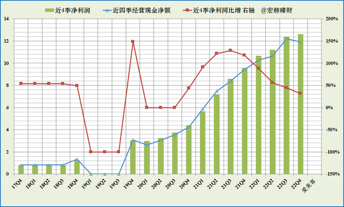 蓝色折线持续在绿色柱图上边及以上显示净利润含金量高。