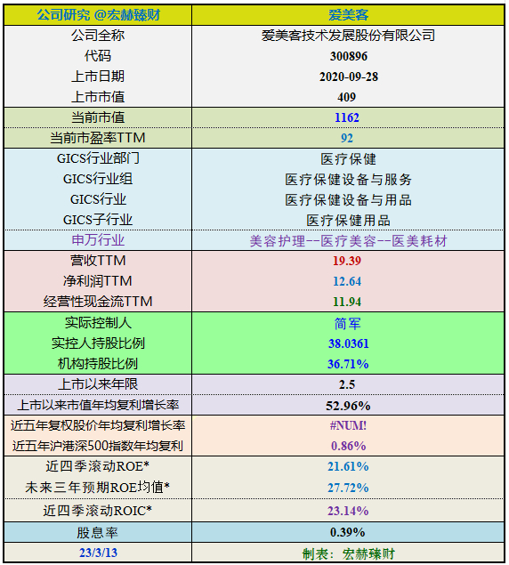 爱美客 自上市以来2.5年的光阴里,市值由409亿走至当前的1162亿。市值年均复利增长率为52.96%,复权股价年化回报率为53.52%,同期沪港深500指数年化回报率为-8.93%。
