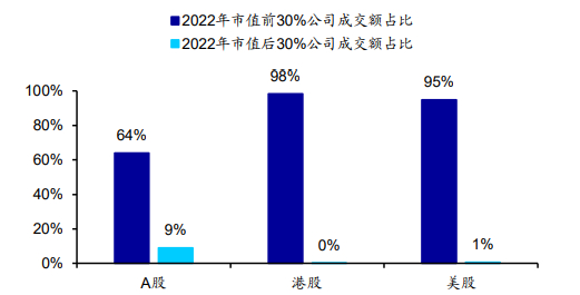 2022年各市场市值前/后30%公司成交额占比