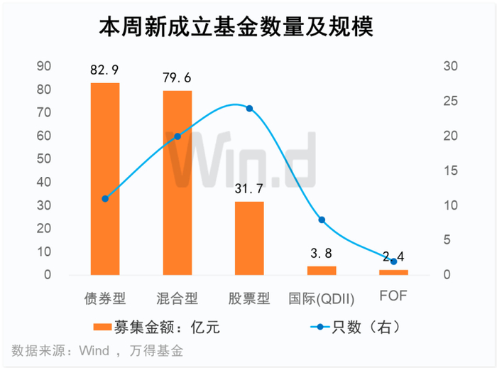 本周合计成立65只基金(ABC类分开统计),合计募集资金200.43亿元。其中,债券型11只,合计募集82.91亿元;混合型20只,合计募集79.58亿元;股票型24只,合计募集31.7亿元;国际(QDII)8只,合计募集3.84亿元;FOF2只,合计募集2.4亿元。