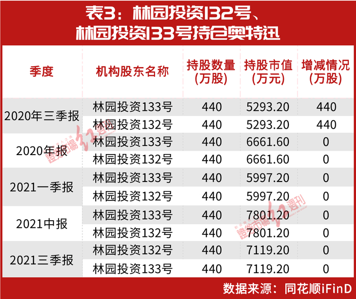 据奥特迅的机构持仓数据显示,2020年三季度末~2021年三季度末,林园投资132号与林园投资133号两只基金均连续出现在前十大流通股股东名单中,两只基金的持仓数量均为440万股,期间未发生变化。