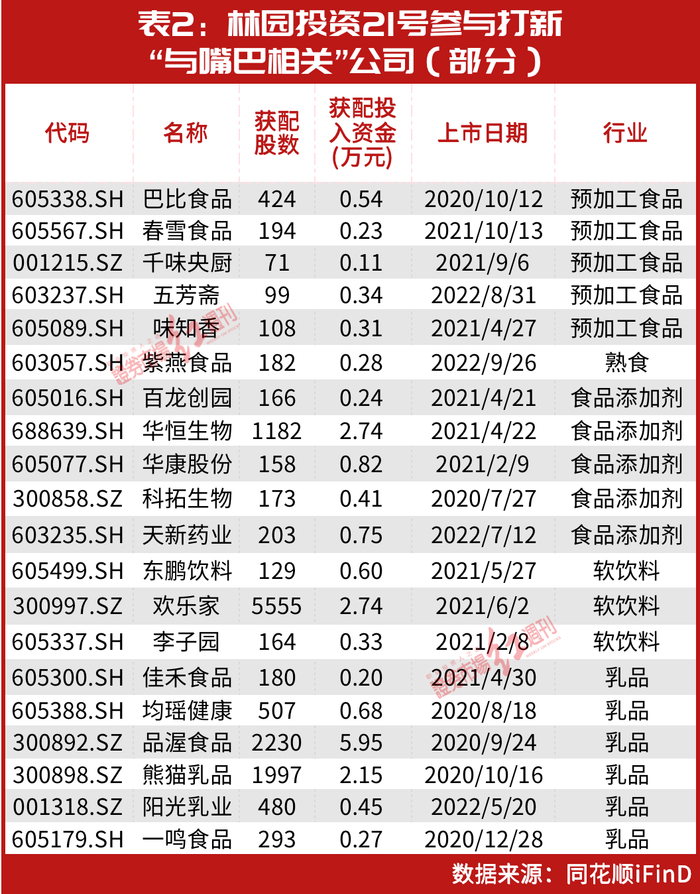 此外,在其他基金的打新名单中,也同样有多只“与嘴巴相关”的标的。以林园投资21号基金为例,2020年以来,其参与首发打新且“与嘴巴相关”的标的涉及预加工食品、熟食、食品添加剂、软饮料、乳品等多个细分领域(见表2)。