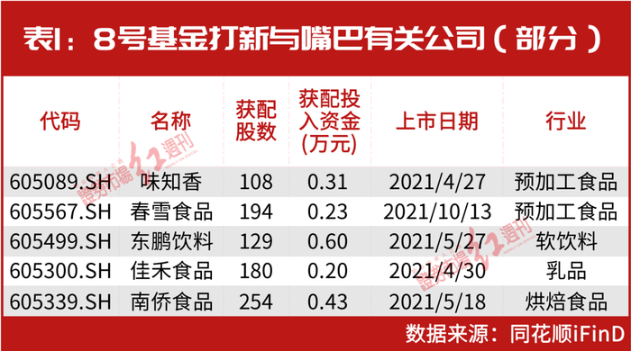 对于参与打新,林园曾经表示,“打新我们一直有参与,也没有过分去选标的,基本上每一个都有参与。”林园另外透露,打新的股票上市以后就会卖掉,“只有和嘴巴有关的不会卖,而且还会加仓”。在8号基金以及其他基金的打新名单中,有不少“与嘴巴相关”的标的。