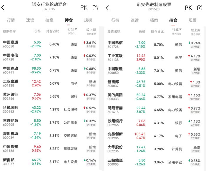 排名第二的诺安韩冬燕,我们在《为什么你们这么牛逼,但就是不火?》中提到过,她的诺安行业轮动和诺安先进制造的第一大重仓股分别是中国联通和中国电信,是在2022年三季报放前十大的,在当时“中特估”的概念还没有爆发。