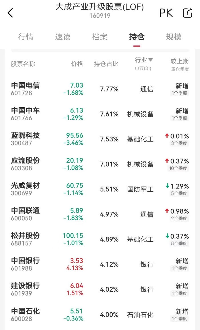 打开大成产业升级的持仓可以看到,22年四季度新晋中国电信、中国中车、中国银行、建设银行、中国石化为前十大重仓股。