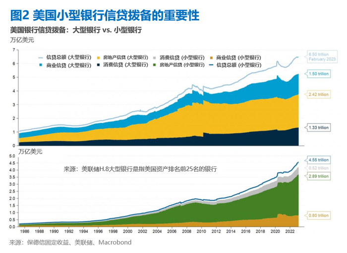 这也在很大程度上取决于信贷环境的变化。小型金融机构往往比大型银行发放更多的贷款——其贷款占存款总额的比例高出大型银行约20个百分点——小型金融机构的贷款占美国银行贷款总额的40%左右 (图2) 。因此,如果由于储户在大型银行寻求更安全的避风港,导致危机蔓延到原本稳健经营的地区性银行,这对经济增长的损害可能相当大。
