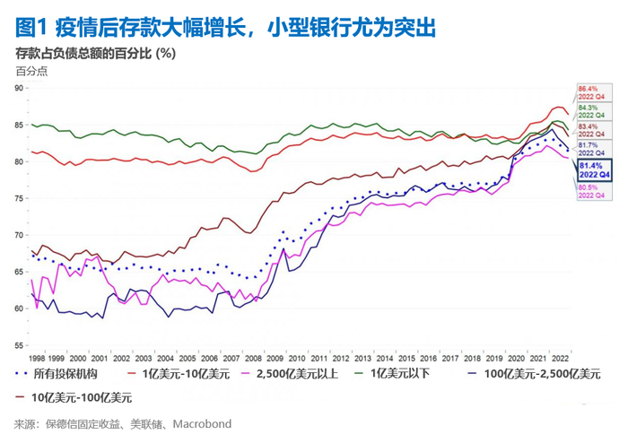 我们认为政策制定者的判断是正确的,即虽然硅谷银行的风险管理实践异乎寻常的糟糕,但其脆弱性并非特例。截至去年年底,美国银行业持有的证券已有远超6,000亿美元的未实现亏损。存款在美国银行总负债中的占比持续上升,这一数字在去年底平均约为80%,且小型银行的这一数据还要平均高出约5个百分点 (图1) 。但在过去三个季度里,存款一直在外流。