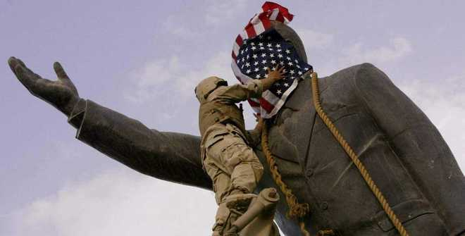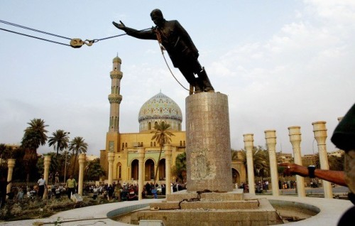 ▲2003年4月9日,美国海军陆战队士兵在巴格达市中心放倒萨达姆.侯赛因的雕像。