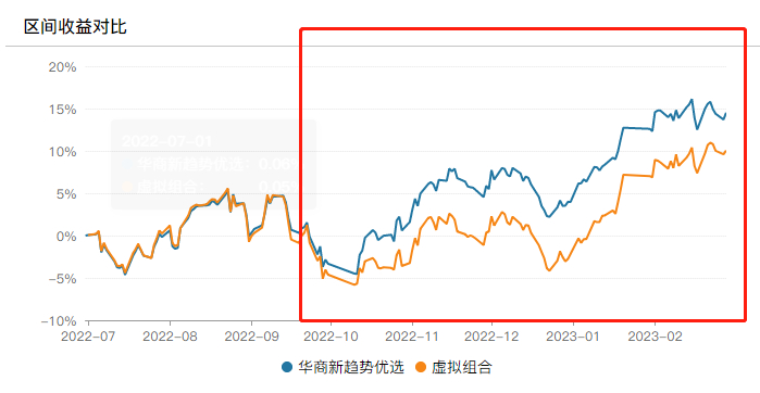 值得注意的是,周海栋在2022年的4季度再度精准切换赛道,可以看到华商新趋势优选的实际净值曲线与重仓股虚拟组合净值曲线在9月份月之前高度重合,而9月之后出现较大幅度分化。