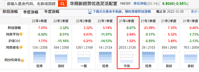例如在2021年的4季度,华商新趋势优选较大幅度跑输市场,当然这并不是周海栋看错方向,而是由于配置的有色和煤炭在上一个季度涨幅过猛出现的短暂回调导致。