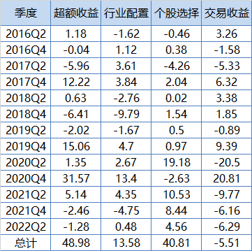 我们用Brinson模型对华商新趋势优选进行超额收益拆解,基准选择沪深300指数,从结果来看,个股选择在长期且稳定贡献超额收益,行业配置在近4年表现也非常突出。