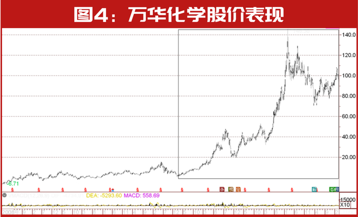 除了股利分红,汇金也斩获了不俗的资本利得。万华化学是异氰酸酯(MDI)的龙头企业,自汇金新进入万华化学前十大流通股股东以来,万华化学股价即迎来持续上涨,2016年初~2022年底,万华化学已累计上涨约15倍(见图4)。