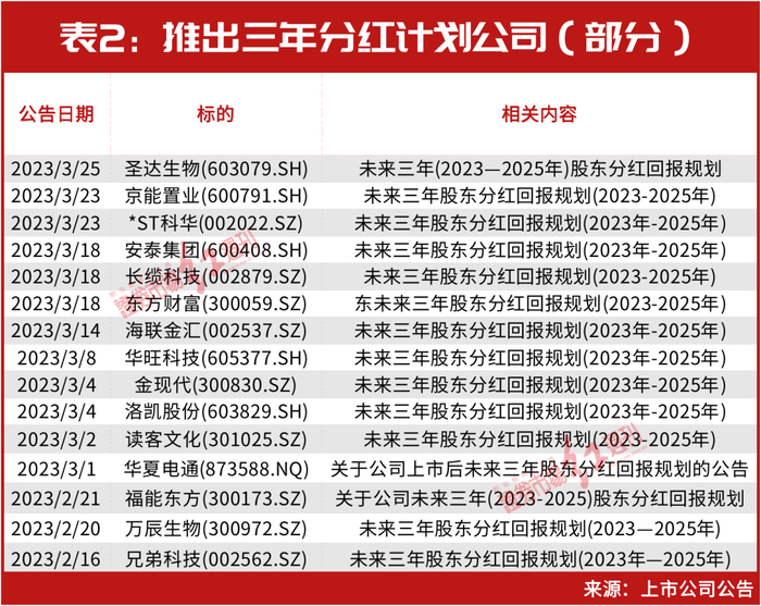 据不完全统计,仅目前来看,已有至少30家公司推出了未来三年(2023—2025)股东的分红规划,如圣达生物、京能置业、安泰集团、东方财富等(见表2)。