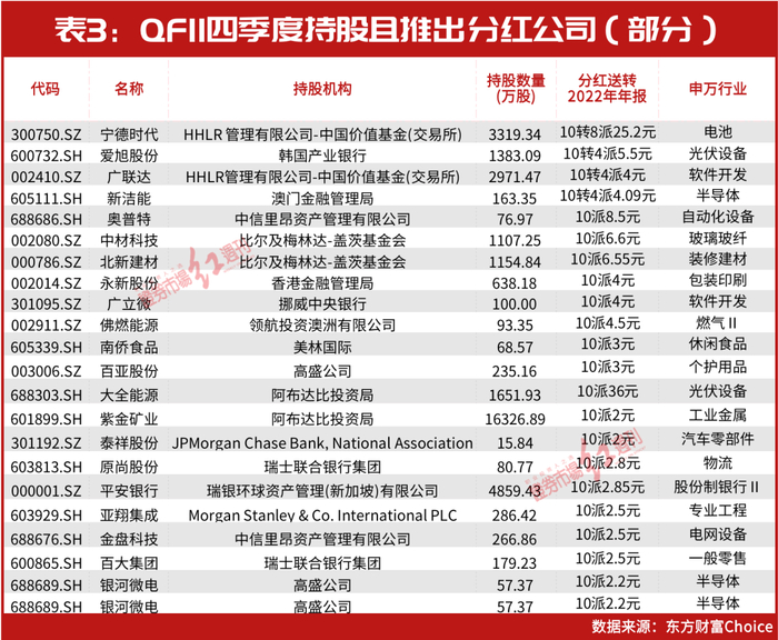 不完全统计显示,QFII目前已出现在60余家公司的前十大流通股股东中,其中,2022年推出分红且每10股派现超过2元的公司有20余家。如韩国产业银行持有的光伏设备公司爱旭股份,2022年度推出了10转4派5.5元的分红预案;澳门金融管理局持有的半导体公司新洁能,推出了10转4派4.09元的分红送转方案。