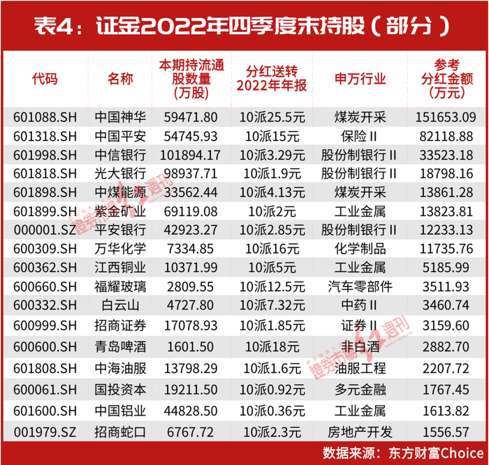 其中,部分个股“红包”金额较高。如中国神华,其于3月24日公布2022年分红预案称,每股派发现金红利2.55元。截至去年四季度末,证金持有中国神华5.9472亿股股份,分红金额将有望达到15亿元。此外,证金持有的光大银行、中煤能源、紫金矿业等公司也有望贡献超亿元的分红(见表4)。