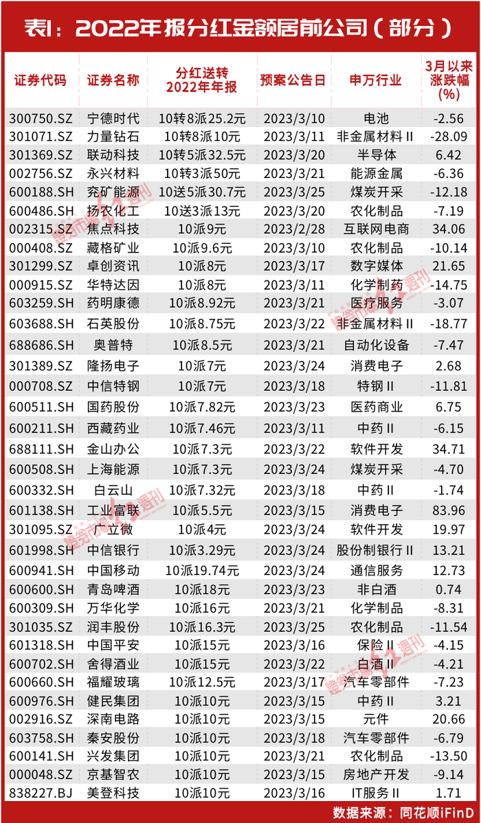 进一步来看,23只个股中有21只推出了2022年度分红预案,证金或因此收获约36亿元的分红。