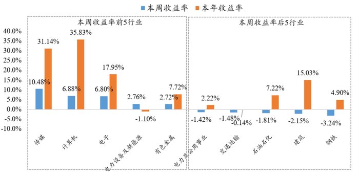 本周涨幅居前的行业为传媒、计算机、电子、电力设备及新能源、有色金属,本周收益率分别达10.48%、6.88%、6.80%、2.76%、2.72%,其中计算机行业今年以来收益较为可观,达到35.83%。钢铁、建筑、石油石化为本周收益排名靠后的行业。