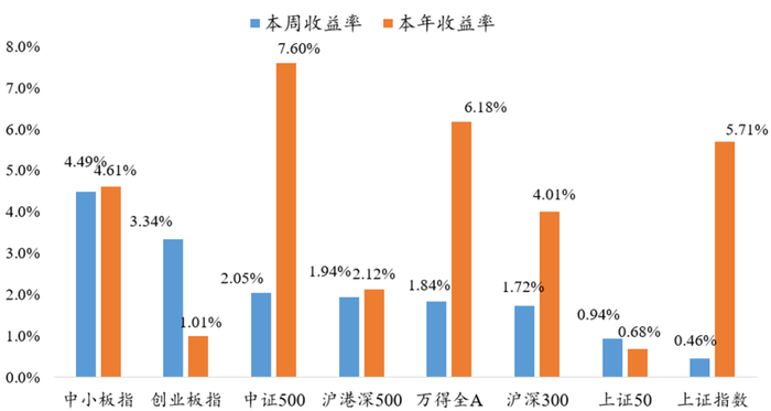 本周市场普遍上涨,小盘股相对大盘股表现更佳。万得全A上涨1.84%,沪深300上涨1.72%,创业板指上升3.34%。