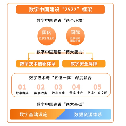 同时《规划》还进一步明确,数字中国建设按照“2522”的整体框架进行布局,即夯实数字基础设施和数据资源体系“两大基础”,推进数字技术与经济、政治、文化、社会、生态文明建设“五位一体”深度融合,强化数字技术创新体系和数字安全屏障“两大能力”,优化数字化发展国内国际“两个环境”。