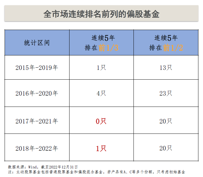 他们的统计结果显示,连续三年排在行业前1/3的基金,在其后两年(即连续五年)仍能排名前1/3的概率非常低,低到只有几只。