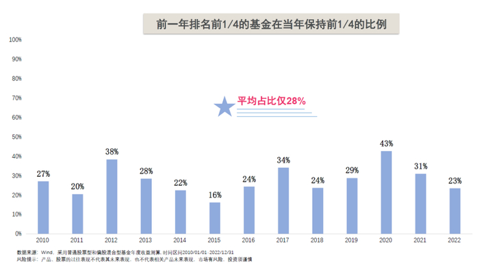 结果是,第一年排名前1/4的基金,第二年还能保持排名前1/4的比例平均只有28%(少了近四分之三)。