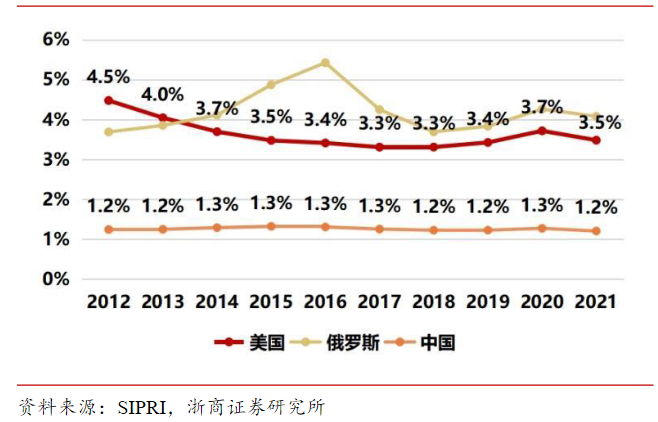 此外,我国国防支出占国内生产总值的比重多年保持基本稳定。根据斯德哥尔摩国际和平研究所(SIPRI)统计,2012-2021年我国国防支出占GDP比例均值在1.3%左右,但较美国、俄罗斯等仍有一定差距,未来有望持续上升。