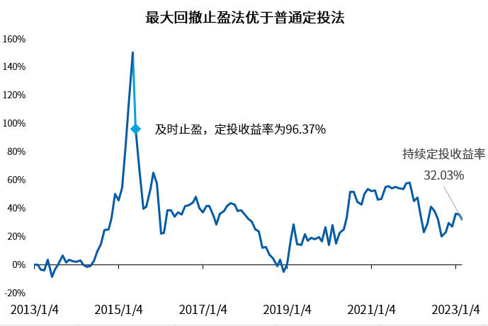 数据来源:Wind。定投指数选取:万得全A指数(881001.WI)。定投区间:2013.1.1-2023.2.28,定投赎回日:2023.3.1,定投基准金额为1000元,每个月首个交易日扣款,最大回撤止盈时点为2015年6月1日。定投模拟累计收益率计算公式为:R=(ΣFn-ΣAn)/ΣAn,其中R为累计收益率,Fn为各期投入的终值,An为各期投入金额。以上测算仅为对万得全A指数过往定投收益率进行模拟测算,不预示未来表现,也不作为投资建议或投资收益保证。基金有风险,投资需谨慎。