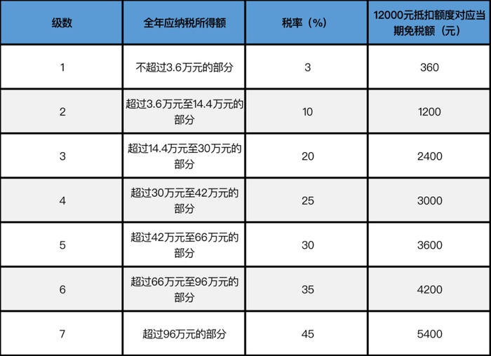 根据新政策测算,12000元的税前扣除额度对应当期免税额大约介于360元至5400元之间,具体如下表所示: