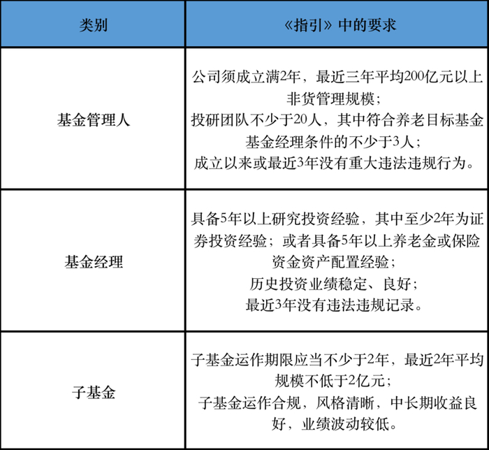 此外,《指引》对养老目标基金的基金管理人、基金经理、以及基金投向的标的基金(简称“子基金”)分别做了详细的规定,总体上比普通基金的要求更严、标准更高。