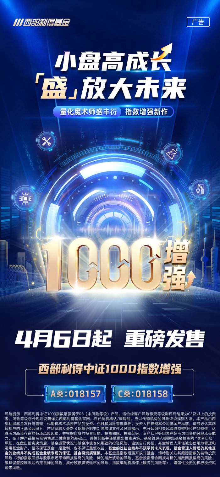 西部利得中证1000指数增强属于R3(中风险等级)产品,适合经客户风险承受等级测评后结果为C3及以上的投资者,风险等级划分规则说明详见西部利得基金官网。在代销机构认/申购时,应以代销机构的风险评级规则为准。