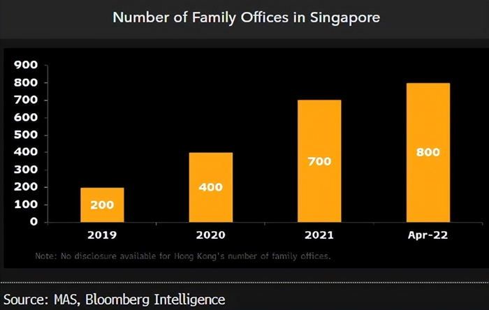 一个自由、开明,对资本友好的城市发展能有多快?看看新加坡家办的增长速度就知道了,2019年时只有200家,而到了2022年4月,已经翻了4倍达到800家。