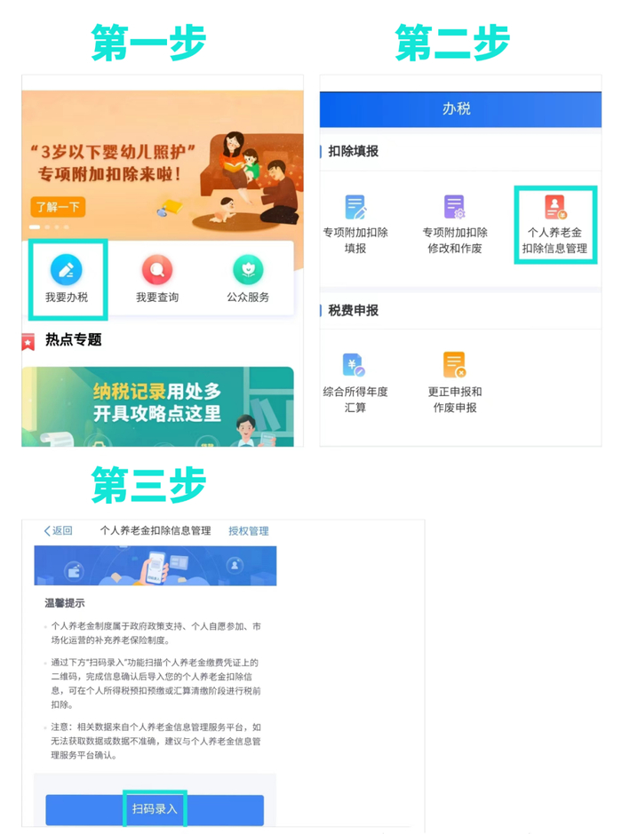 打开个人所得税APP,进入“我要办税——扣除填报——个人养老金扣除信息管理——扫码录入”功能,扫描个人养老金缴费凭证右上角的二维码,就可以自动录入扣除信息。