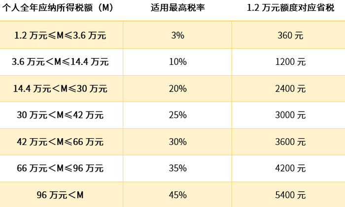 假设顶格缴纳1.2万元个人养老金,1.2万元≤全年应纳税所得额≤3.6万元(对应的税率为3%),那么可以享受360元(12000元×3%)税收优惠。