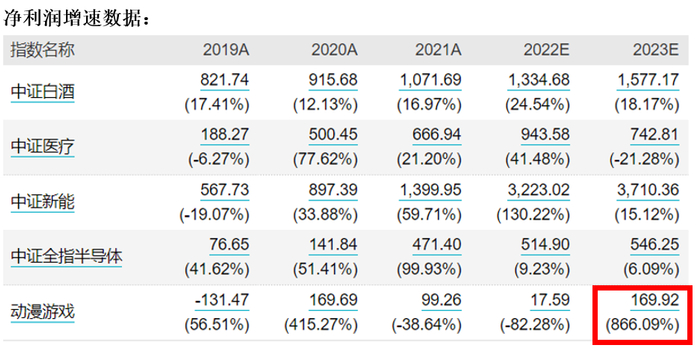 根据wind数据统计,动漫游戏指数2023年盈利预测增速为866%,这个增速非常高了。