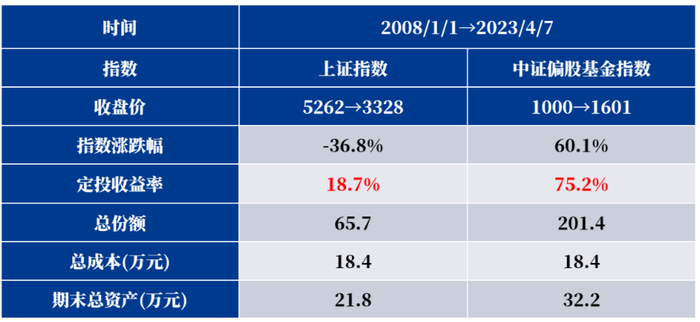 数据来源:兴证全球基金、Wind,2008/1/1-2023/4/7,假设指数收盘价相当于每份额的价格,每月1日定投1000元、不计算费用。以上数据仅为根据历史数据的模拟测算,测算结果仅供参考,不代表真实收益,不作为投资策略推荐和收益保证,历史数据不代表未来表现和收益承诺,基金投资有风险,需谨慎选择。