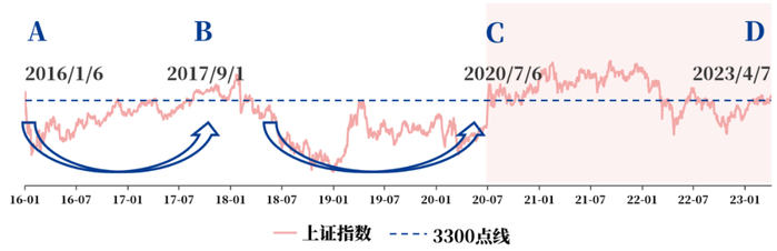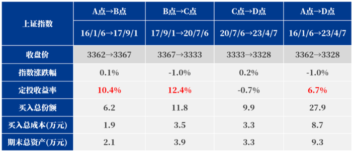 不妨以上证指数中短期数据为例:下图可见,2016年以来,上证指数多次穿梭于3300点附近,我们选取了具有阶段代表性的A、B、C、D四个3300点附近的时间点,统计期间的定投结果。