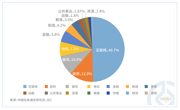 据中国信通院统计,截至2022年,算力需求最大的行业是互联网,占整体算力份额的49.7%,其次,政府、服务和电信业也在加大算力投入,占比分别为12%、10%、7.2%。