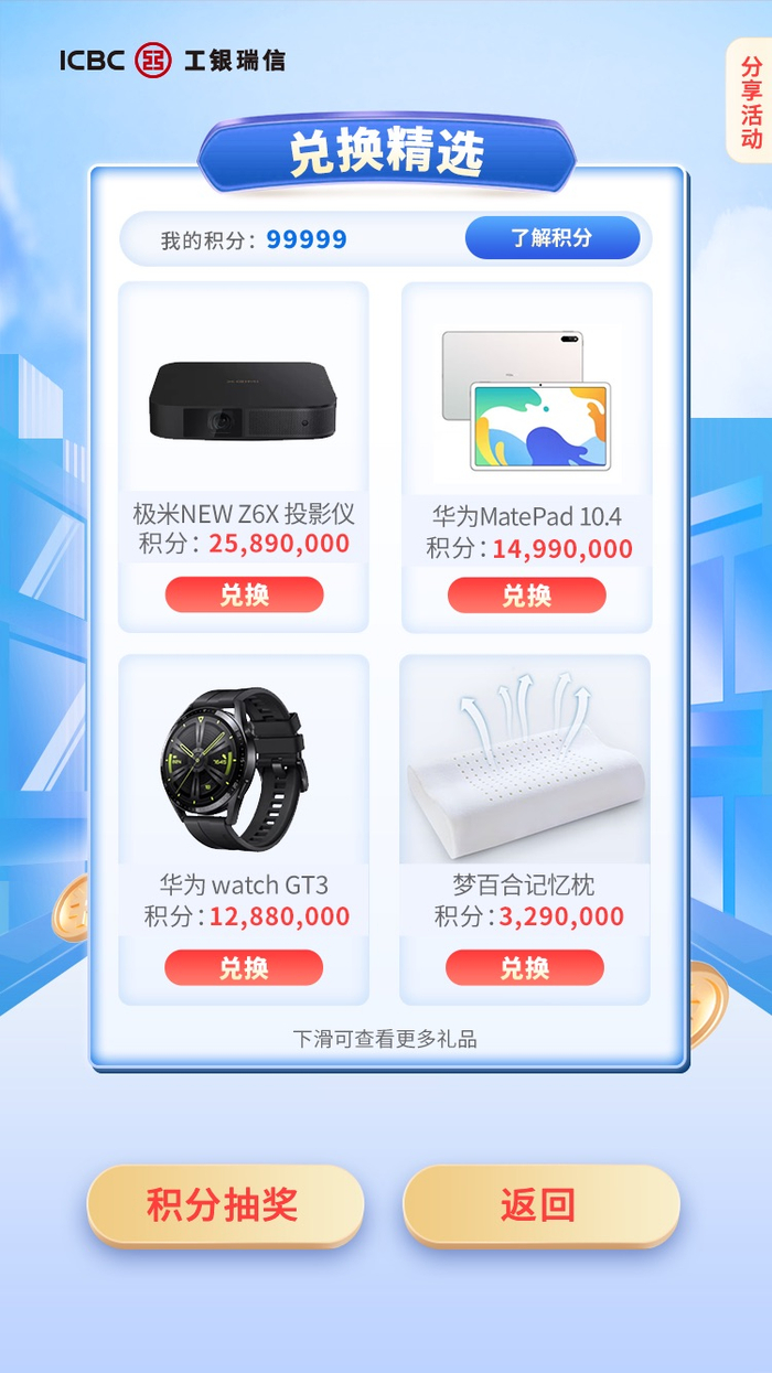 4月18日起【工银瑞信·积分回馈】活动正式开启。登陆工银瑞信APP,查询您的积分,进行积分兑换、积分抽奖,参与活动即有机会兑换极米NEW Z6X 投影仪、华为MatePad 10.4、华为 watch GT3……