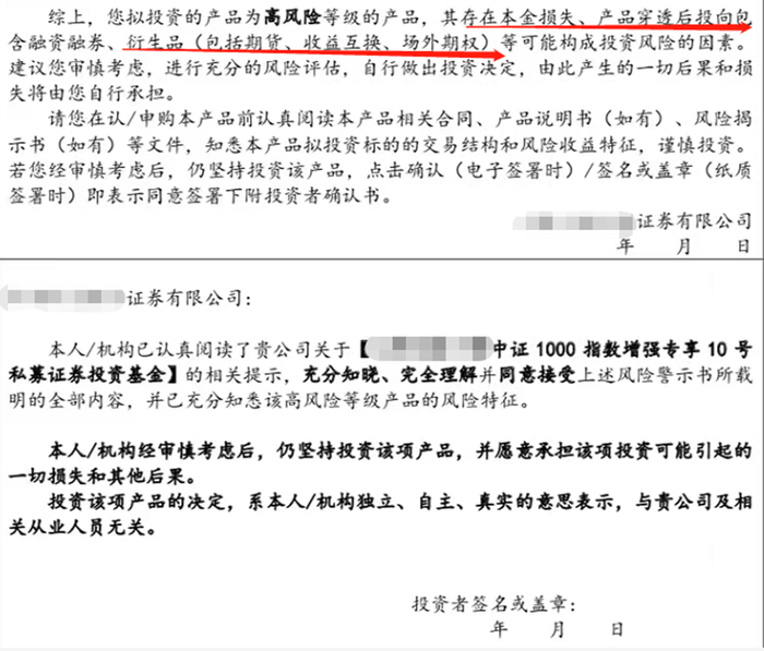 资事堂发现:高净值投资者在一家头部代销平台,申购知名量化私募的产品时,需要签署一份风险警示书。