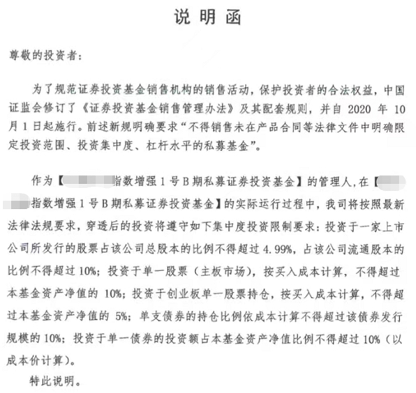(如上图)量化私募M的说明函指出:基金穿透后投资于一家上市公司股票占公司总股本比例不超过4.99%,占该公司流通股本比例不超过10%;投资单一股票的买入成本,不超过基金资产净值10%等等。