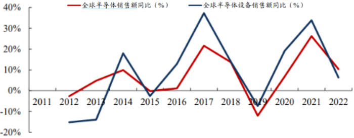 历史数据表明,全球半导体设备销售额与半导体销售额同比增速呈现高度联动效应,同时在行业上行周期时,半导体设备可以表现出更高的同比增速,具备更强增长弹性。