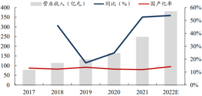 收入口径下,预计2022年11家半导体设备企业合计实现营收378亿元,同比+54%,对应半导体设备市场整体国产化率仍不足20%。