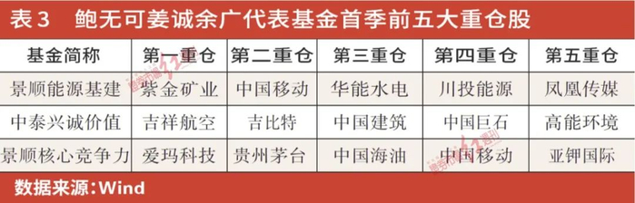 一季报显示,鲍无可当季加仓中国移动大约15万股,从而使该股从上一季的第三重仓升至第二重仓,不过中国电信却退出了前一季的前十。同时他加仓了川投能源、紫金矿业、华能水电,新近重仓了铜陵有色和神火股份,表明了其对这一类资源股格外垂青。此外,他对于小众的中南传媒和凤凰传媒依然持续青睐。